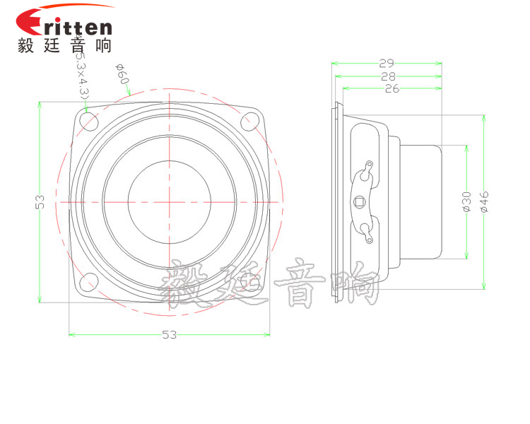 45mm方形鐵盆架內磁全頻喇叭,采用高性能稀土高強磁,靈敏度高,磁性強,音色清晰;