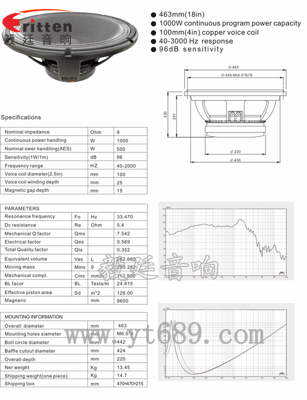 此款優異用于18寸100芯500瓦重低音喇叭,最大峰值1000W,音域40Hz~2KHz,超重低音炮,音色清晰、質感飽滿,也可用于舞臺音響喇叭、KTV音箱、廣場音箱上,受到廣大客戶的信賴。